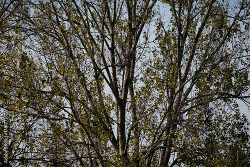 © Nataliia, Fototapeta premium Branches and leaves of a tall tree against the sky in early autumn