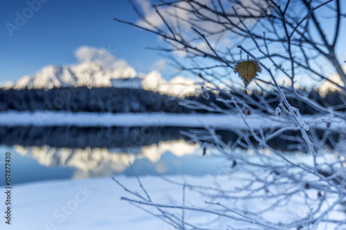 Obraz premium Branches covered with frost around Lake Palù where the snowy peaks and woods are reflected Malenco Valley Lombardy Italy Europe