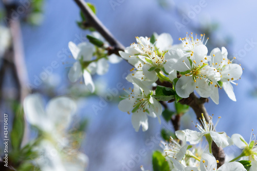 © ptgregus, Obraz premium Branches of a blossoming cherry tree on a sunny spring day in the garden.