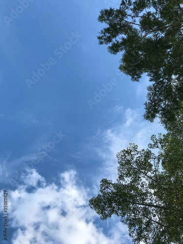 © Wijitra, Obraz premium Branches of a tree against blue sky close up. Tree stick against blue sky background.