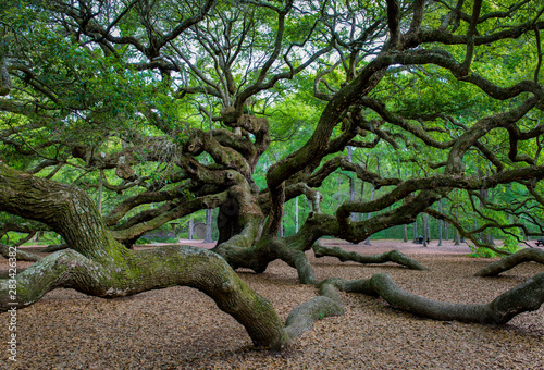 Obraz premium Branches of ancient Angel Oak, a 500-year-old southern live oak (Quercus virginiana) on Johns Island near Charleston, South Carolina. Longest branch is nearly 190 feet long.