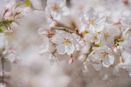 © Volodymyr, Fototapeta premium Branches of blossoming cherry on blue sky background. Spring photo of blossom spring nature. White flowers the fruit tree. Cherry blossoms white flowers against a blue sky.