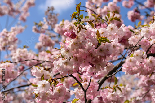 Obraz premium Branches of blossoming pink sakura against the white-blue sky .