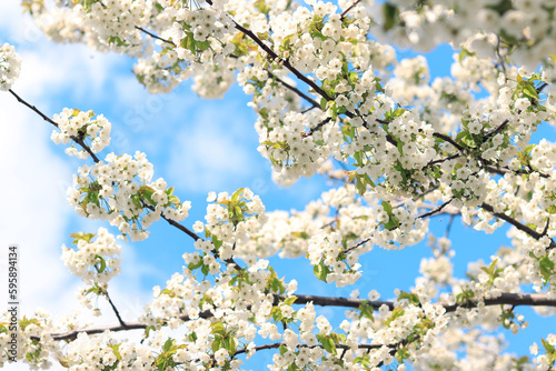 Obraz premium Branches of blossoming white cherries against a blue sky, selective focus....