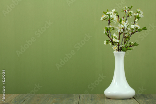 © Studio KIVI, Fototapeta premium branches of cherry blossoms in a vase on a wooden background
