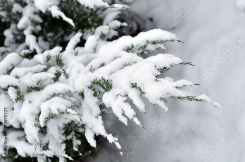 © wolfelarry, Obraz premium Branches of christmas tree with snow outdoor