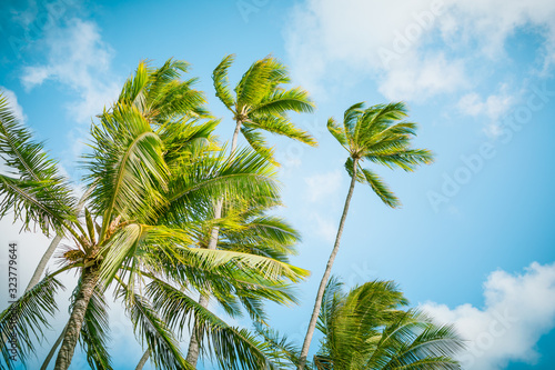 © kieferpix, Fototapeta premium Branches of coconut palms under blue sky.