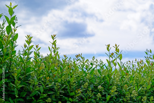 Obraz premium Branches of privet hedge (ligustrum) against cloudy blue sky