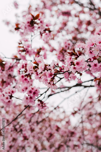 © Ирина Санжаровская, Fototapeta premium Branches with blooming pink cherries against the sky