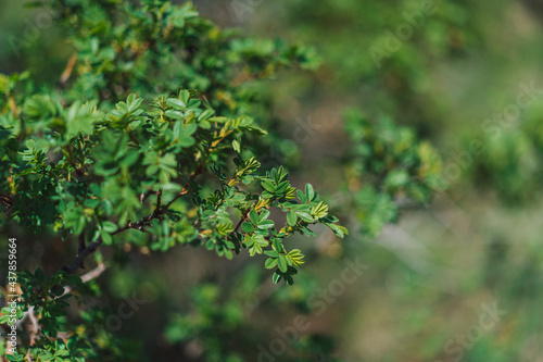 © Anastassiya , Obraz premium Branches with leaves of wild rose close-up. Spring time concept