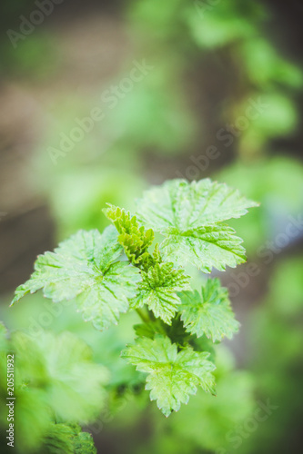 Fototapeta premium Branches with new leaves in the garden. Selective focus.