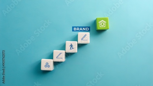 © rashedhossain, Obraz premium Brand Stairway to Success: A conceptual visual of a "brand" name sits on a blue background, with cubes arranged in a rising staircase, representing steps towards success.