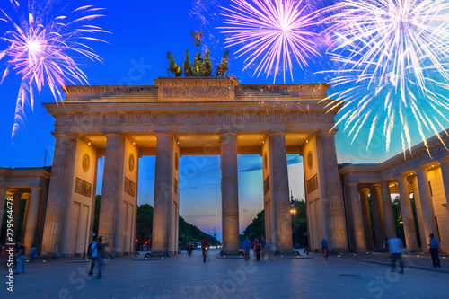 © neirfy, Fototapeta premium Brandenburg gate at night with fireworks, Berlin, Germany. HDR