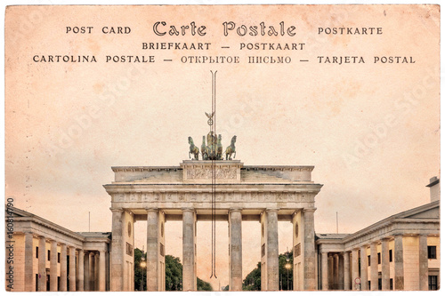 © Delphotostock, Naklejka premium Brandenburg gate in Berlin, Germany, collage on sepia vintage postcard background