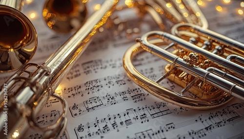 © Murda, Obraz premium Brass musical instruments on sheet music.