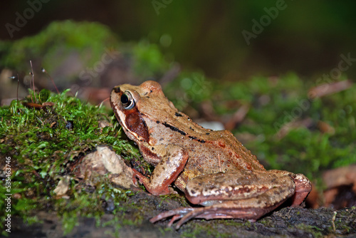 Fototapeta premium Brauner Laubfrosch sitzt auf dem Waldboden
