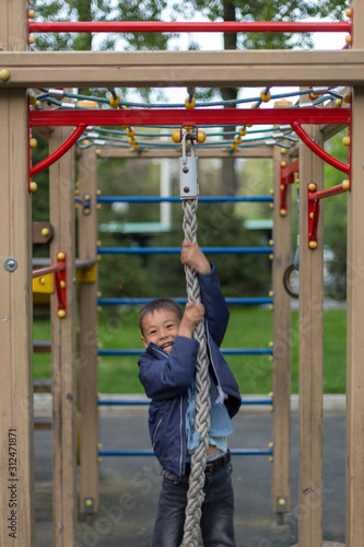 Obraz premium brave boy playing on the playground and going down with ropes down