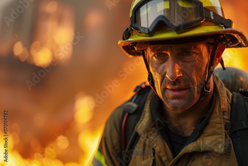 Fototapeta premium Brave firefighter in action with flames and rubble in the background,...