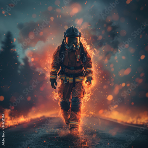 © Pakkarada, Fototapeta premium Brave firefighter in full gear walks through flames, showcasing courage and danger in a dramatic, intense scene set ablaze.