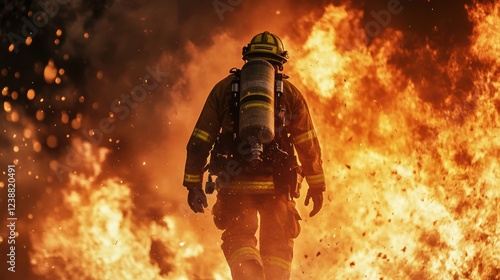 Fototapeta premium Brave Firefighter Walking Toward Intense Flames at Nighttime Scene