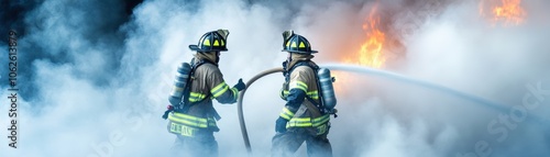 © Mnt, Naklejka premium Brave firefighters combat a blazing fire, showcasing teamwork and determination in a smoky environment.