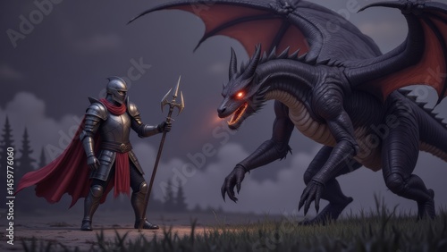 Fototapeta premium Brave Knight Confronts Fierce Dragon: Epic Battle in Fantasy Landscape