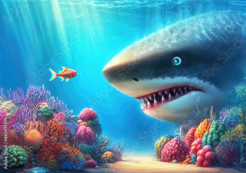 © Varitnan, Fototapeta premium Brave small fish face to face and against big shark, generative Ai. business concept.