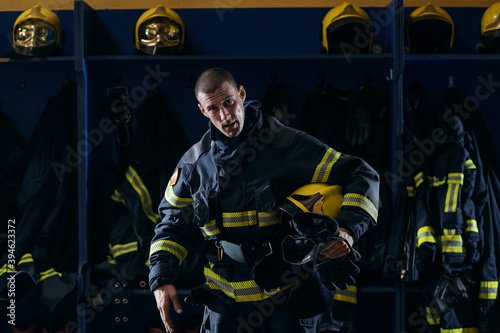 © Dusan Petkovic, Obraz premium Brave young attractive firefighter in protective uniform holding helmet under armpit after action while standing in fire station.