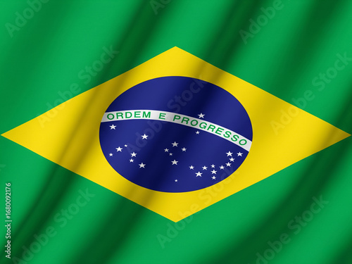 © SuperImages, Fototapeta premium Brazilian national flag with green background, yellow diamond, blue globe, white stars, and symbolic patriotic message