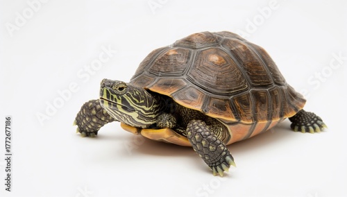 © TheWaterMeloonProjec, Naklejka premium Brazilian turtle with a cute expression and a baby turtle on a white background, focus on nurturing bond