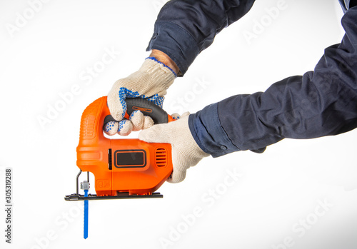 Fototapeta premium brazos de hombre con buzo azul y guantes agarrando una herramienta