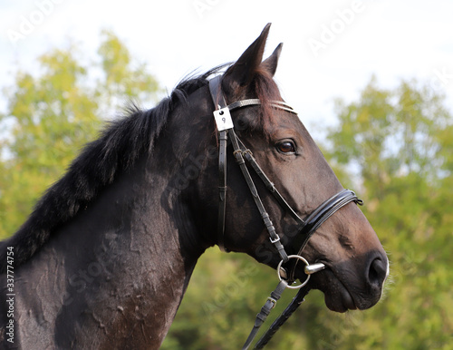 © acceptfoto, Obraz premium Brązowy koń wyścigowy na naturalnym zielonym rozmycie tła w słońcu
