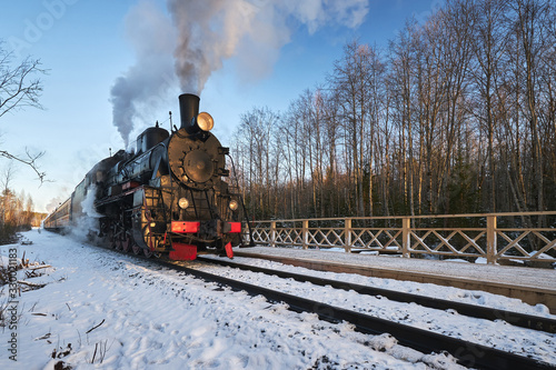 © vladimirzhoga, Obraz premium Brązowy pociąg ekspresowy w Karelii