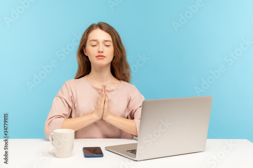 © khosrork, Naklejka premium Break at work, yoga practice. Calm woman employee sitting at workplace with laptop and raising hands in namaste gesture, meditating at home office. indoor studio shot isolated on blue background