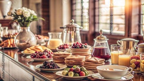 © Chenda, Naklejka premium Breakfast buffet hotel pancakes fresh fruit coffee carafes Bright dining room blurred guests background