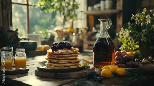 © MochSjamsul, Fototapeta premium Breakfast food theme with pancakes, syrup, and fresh fruit on a rustic table background for an ads
