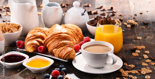 Obraz premium Breakfast served with coffee, juice, croissants and fruits