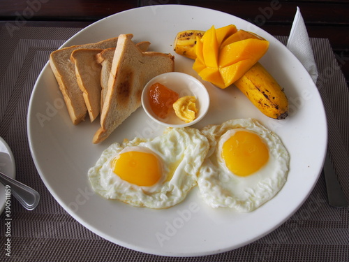 Fototapeta premium Breakfast set, Sunny-Side Up Fried Eggs, Sandwich, Mango, Banana, and Jam, Nalusuan Island, Cebu, Philippines