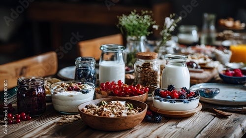 © Reyhan, Naklejka premium Breakfast spread on a rustic wooden table.