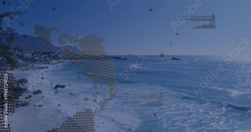 Fototapeta premium Breaking ocean waves sending white foam toward sandy beach by coastal houses, with halftone overlay