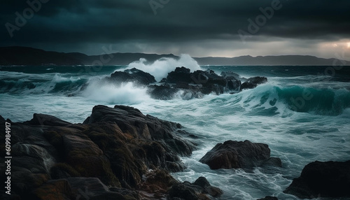 © djvstock, Fototapeta premium Breaking waves crash against rocky coastline under dramatic sky generated by AI