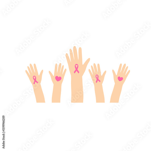 Fototapeta premium Breast cancer awareness hands. Human hands with pink ribbons support symbol.