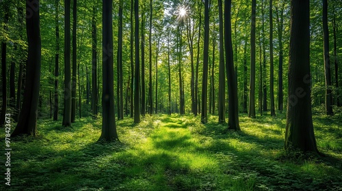 Fototapeta premium Breathe in the fresh air while walking through a serene forest, surrounded by tall, green trees Wellness, Greenery, breathe, forest