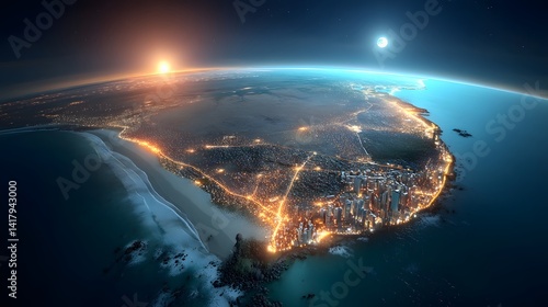 © thanarak, Obraz premium Breathtaking aerial perspective of South Africa s major cities including Cape Town and Johannesburg illuminated at night against the backdrop of the coastline and ocean horizon