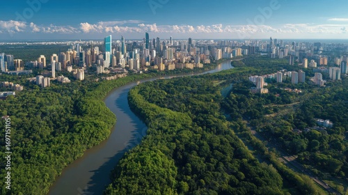 © Dannang, Obraz premium Breathtaking aerial view capturing the Edmonton skyline with lush river valley