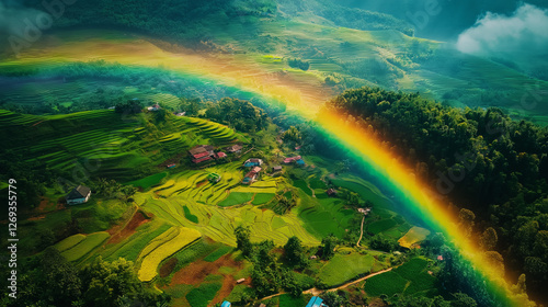 Obraz premium Breathtaking aerial view of a lush green valley with a vibrant rainbow, symbolizing nature’s beauty, harmony, and hope, perfect for travel, inspiration, and environmental themes