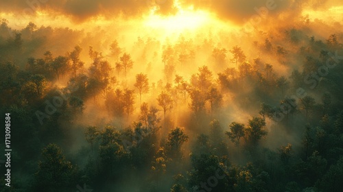 Fototapeta premium Breathtaking aerial view of a misty forest bathed in golden sunrise light, with sun rays piercing through the fog and illuminating the tree canopy.