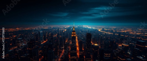 © ruzty art, Obraz premium Breathtaking aerial view of a sprawling metropolis at night, with towering skyscrapers illuminating the urban landscape under a deep blue sky