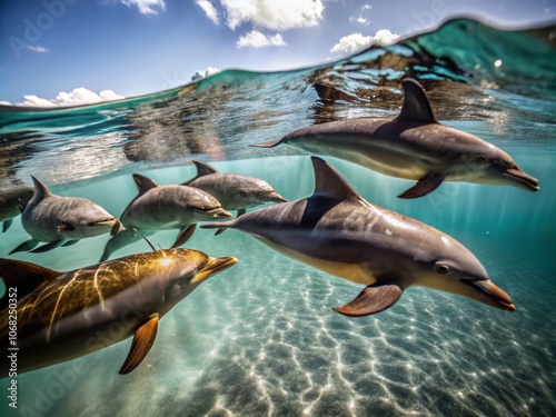 Fototapeta premium Breathtaking Aerial View of Dolphins Swimming in Crystal Clear Waters...