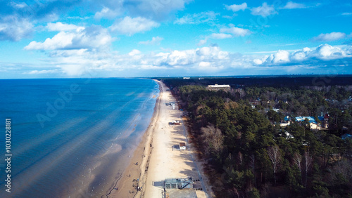 © Dave, Fototapeta premium Breathtaking aerial view of Jurmala's coastline showcasing golden sands and lush greenery under a vibrant blue sky in late afternoon light